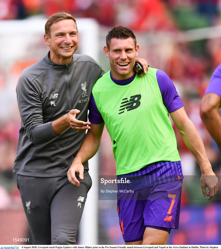 4 August 2018; Liverpool coach Pepijn Lijnders with James Milner prior to the Pre Season Friendly match between Liverpool and Napoli at the Aviva Stadium in Dublin. Photo by Stephen McCarthy/Sportsfile