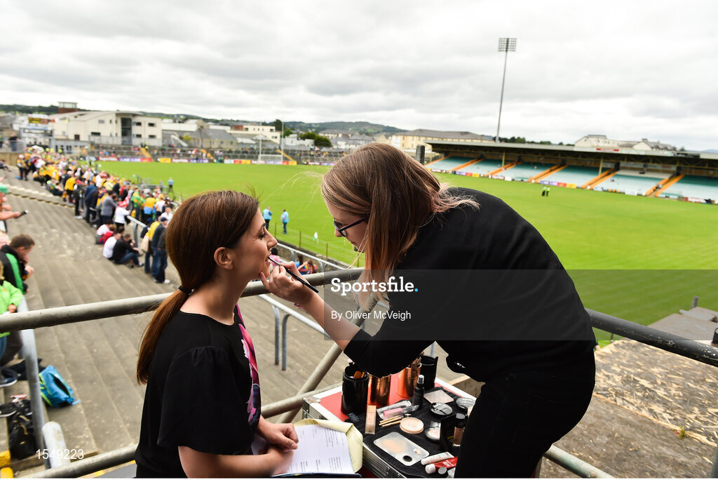 5 August 2018; RTE Sunday Game presenter Joanne Cantwell getting her make-up applied before the GAA Football All-Ireland Senior Championship Quarter-Final Group 2 Phase 3 match between Tyrone and Donegal at MacCumhaill Park in Ballybofey, Co Donegal. Photo by Oliver McVeigh/Sportsfile