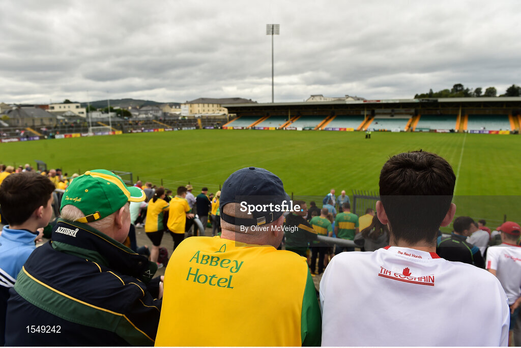 5 August 2018; A general view of supporters on the terrace before the GAA Football All-Ireland Senior Championship Quarter-Final Group 2 Phase 3 match between Tyrone and Donegal at MacCumhaill Park in Ballybofey, Co Donegal. Photo by Oliver McVeigh/Sportsfile