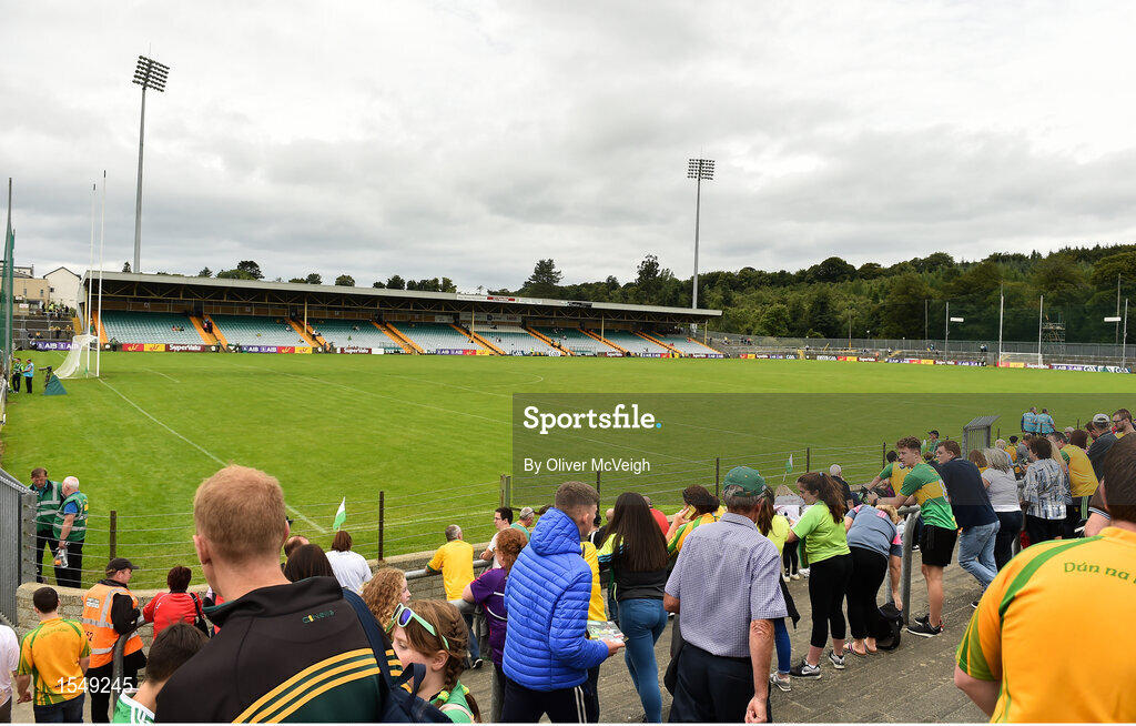 5 August 2018; A general view of supporters on the terrace before the GAA Football All-Ireland Senior Championship Quarter-Final Group 2 Phase 3 match between Tyrone and Donegal at MacCumhaill Park in Ballybofey, Co Donegal. Photo by Oliver McVeigh/Sportsfile