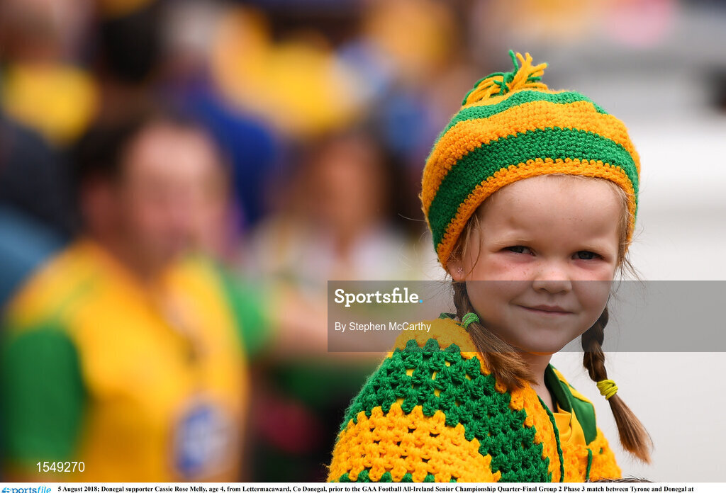 5 August 2018; Donegal supporter Cassie Rose Melly, age 4, from Lettermacaward, Co Donegal, prior to the GAA Football All-Ireland Senior Championship Quarter-Final Group 2 Phase 3 match between Tyrone and Donegal at MacCumhaill Park in Ballybofey, Co Donegal. Photo by Stephen McCarthy/Sportsfile