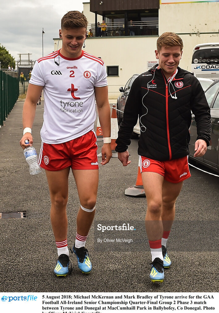 5 August 2018; Michael McKernan and Mark Bradley of Tyrone arrive for the GAA Football All-Ireland Senior Championship Quarter-Final Group 2 Phase 3 match between Tyrone and Donegal at MacCumhaill Park in Ballybofey, Co Donegal. Photo by Oliver McVeigh/Sportsfile