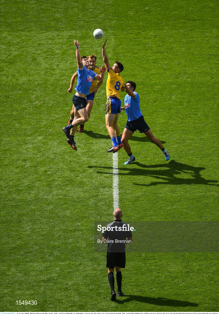5 August 2018; Michael Darragh MacAuley, left, and Cian O'Sullivan of Dublin compete for the throw-in against Enda Smith, left, and Tadhg O'Rourke of Roscommon during the GAA Football All-Ireland Senior Championship Quarter-Final Group 2 Phase 3 match between Dublin and Roscommon at Croke Park in Dublin. Photo by Daire Brennan/Sportsfile