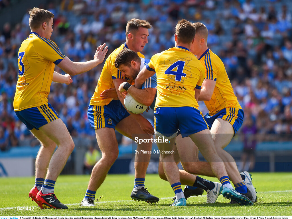 5 August 2018; Kevin McManamon of Dublin in action against Roscommon players, from left, Peter Domican, John McManus, Niall McInerney, and Darra Pettit during the GAA Football All-Ireland Senior Championship Quarter-Final Group 2 Phase 3 match between Dublin and Roscommon at Croke Park in Dublin. Photo by Piaras Ó Mídheach/Sportsfile