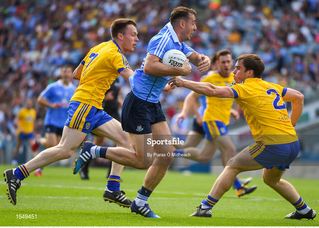 5 August 2018; Cormac Costello of Dublin in action against Ross Timothy, left, and David Murray of Roscommon during the GAA Football All-Ireland Senior Championship Quarter-Final Group 2 Phase 3 match between Dublin and Roscommon at Croke Park in Dublin. Photo by Piaras Ó Mídheach/Sportsfile