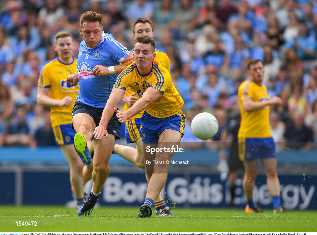 5 August 2018; Paul Flynn of Dublin scores his side's first goal despite the efforts of John McManus of Roscommon during the GAA Football All-Ireland Senior Championship Quarter-Final Group 2 Phase 3 match between Dublin and Roscommon at Croke Park in Dublin. Photo by Piaras Ó Mídheach/Sportsfile