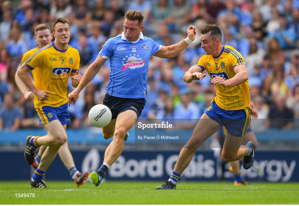 5 August 2018; Paul Flynn of Dublin scores his side's first goal despite the efforts of John McManus of Roscommon during the GAA Football All-Ireland Senior Championship Quarter-Final Group 2 Phase 3 match between Dublin and Roscommon at Croke Park in Dublin. Photo by Piaras Ó Mídheach/Sportsfile