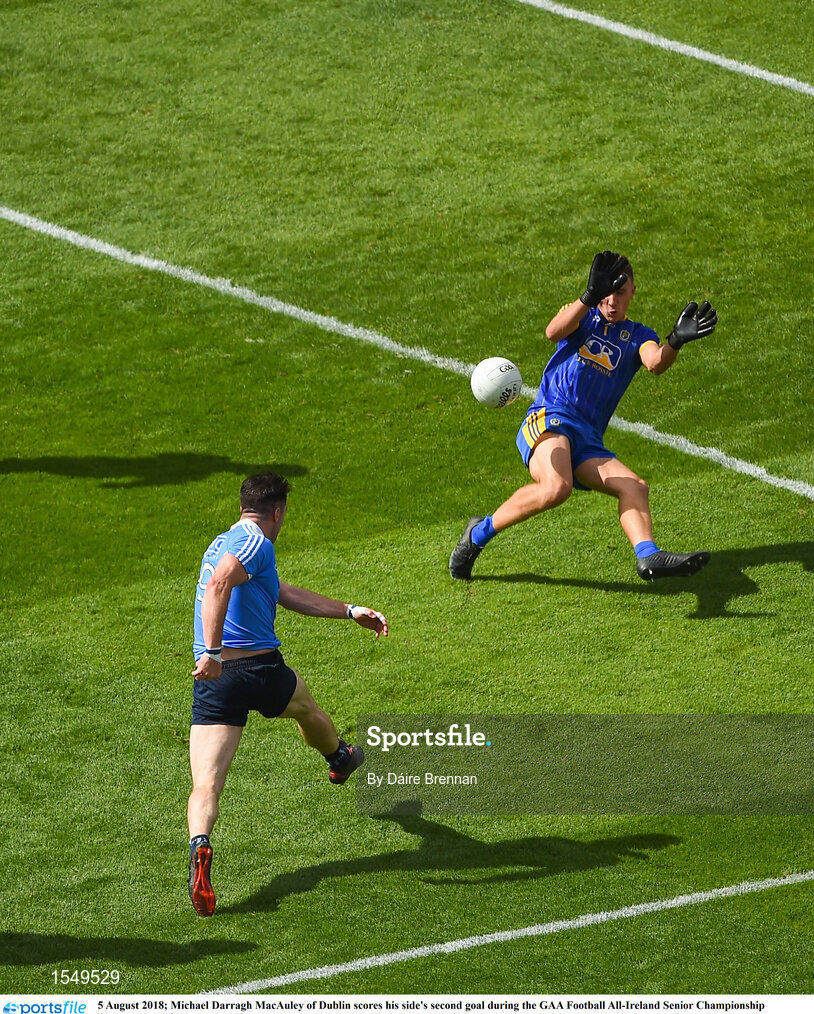 5 August 2018; Michael Darragh MacAuley of Dublin scores his side's second goal during the GAA Football All-Ireland Senior Championship Quarter-Final Group 2 Phase 3 match between Dublin and Roscommon at Croke Park in Dublin. Photo by Daire Brennan/Sportsfile