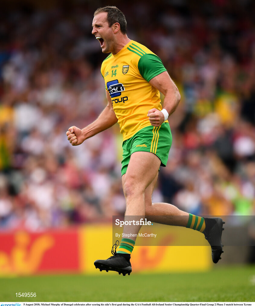 5 August 2018; Michael Murphy of Donegal celebrates after scoring his side's first goal during the GAA Football All-Ireland Senior Championship Quarter-Final Group 2 Phase 3 match between Tyrone and Donegal at MacCumhaill Park in Ballybofey, Co Donegal. Photo by Stephen McCarthy/Sportsfile