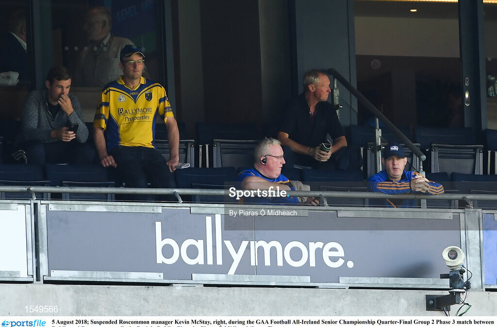 5 August 2018; Suspended Roscommon manager Kevin McStay, right, during the GAA Football All-Ireland Senior Championship Quarter-Final Group 2 Phase 3 match between Dublin and Roscommon at Croke Park in Dublin. Photo by Piaras Ó Mídheach/Sportsfile