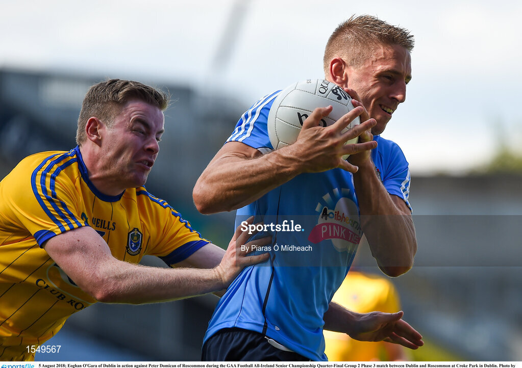 5 August 2018; Eoghan O'Gara of Dublin in action against Peter Domican of Roscommon during the GAA Football All-Ireland Senior Championship Quarter-Final Group 2 Phase 3 match between Dublin and Roscommon at Croke Park in Dublin. Photo by Piaras Ó Mídheach/Sportsfile