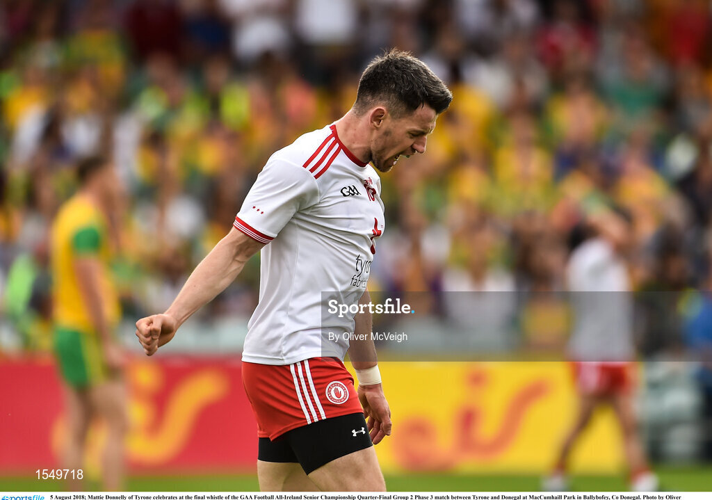 5 August 2018; Mattie Donnelly of Tyrone celebrates at the final whistle of the GAA Football All-Ireland Senior Championship Quarter-Final Group 2 Phase 3 match between Tyrone and Donegal at MacCumhaill Park in Ballybofey, Co Donegal. Photo by Oliver McVeigh/Sportsfile