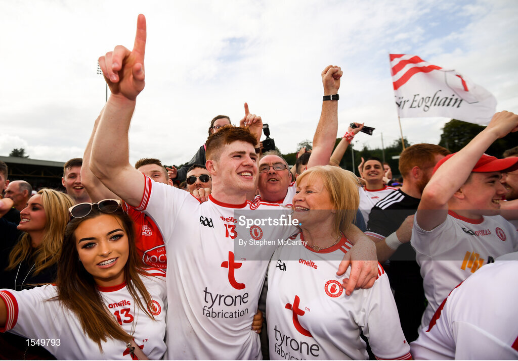5 August 2018; Cathal McShane of Tyrone celebrates with his mother Theresa following the GAA Football All-Ireland Senior Championship Quarter-Final Group 2 Phase 3 match between Tyrone and Donegal at MacCumhaill Park in Ballybofey, Co Donegal. Photo by Stephen McCarthy/Sportsfile