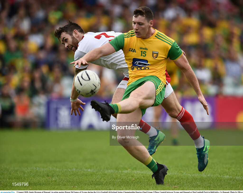 5 August 2018; Jamie Brennan of Donegal in action against Ronan McNamee of Tyrone during the GAA Football All-Ireland Senior Championship Quarter-Final Group 2 Phase 3 match between Tyrone and Donegal at MacCumhaill Park in Ballybofey, Co Donegal. Photo by Oliver McVeigh/Sportsfile