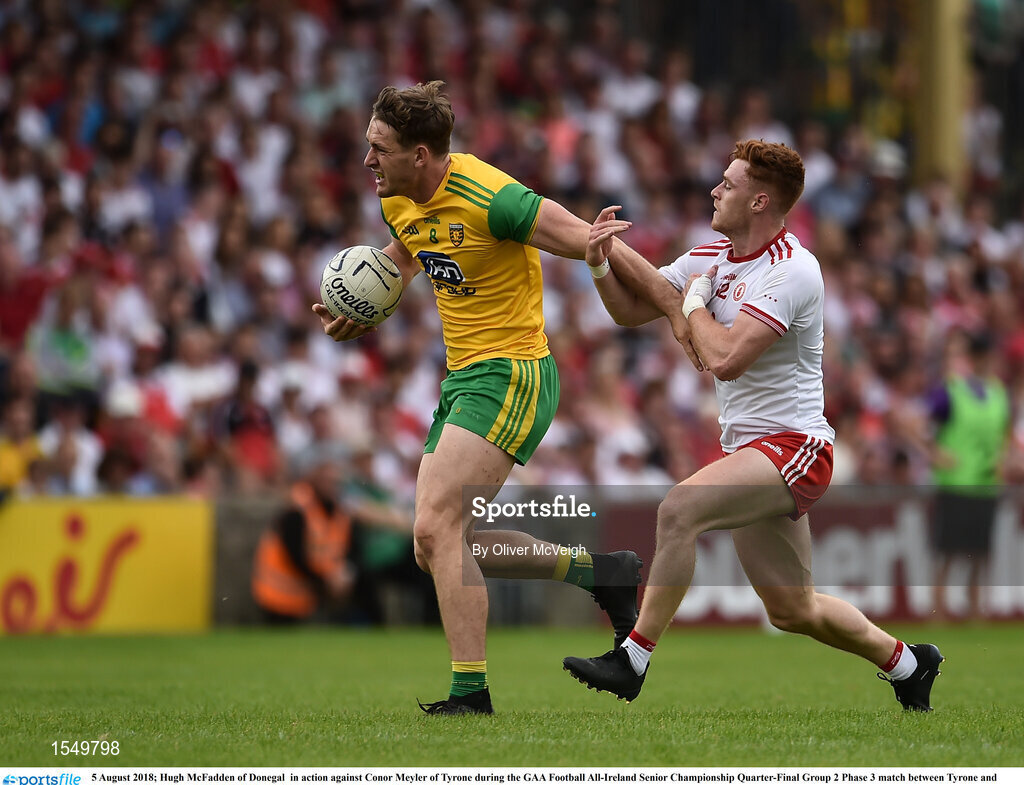 5 August 2018; Hugh McFadden of Donegal in action against Conor Meyler of Tyrone during the GAA Football All-Ireland Senior Championship Quarter-Final Group 2 Phase 3 match between Tyrone and Donegal at MacCumhaill Park in Ballybofey, Co Donegal. Photo by Oliver McVeigh/Sportsfile