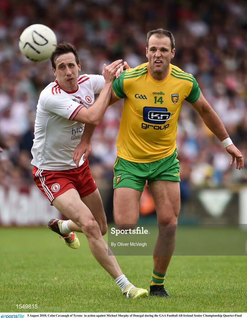 5 August 2018; Colm Cavanagh of Tyrone in action against Michael Murphy of Donegal during the GAA Football All-Ireland Senior Championship Quarter-Final Group 2 Phase 3 match between Tyrone and Donegal at MacCumhaill Park in Ballybofey, Co Donegal. Photo by Oliver McVeigh/Sportsfile