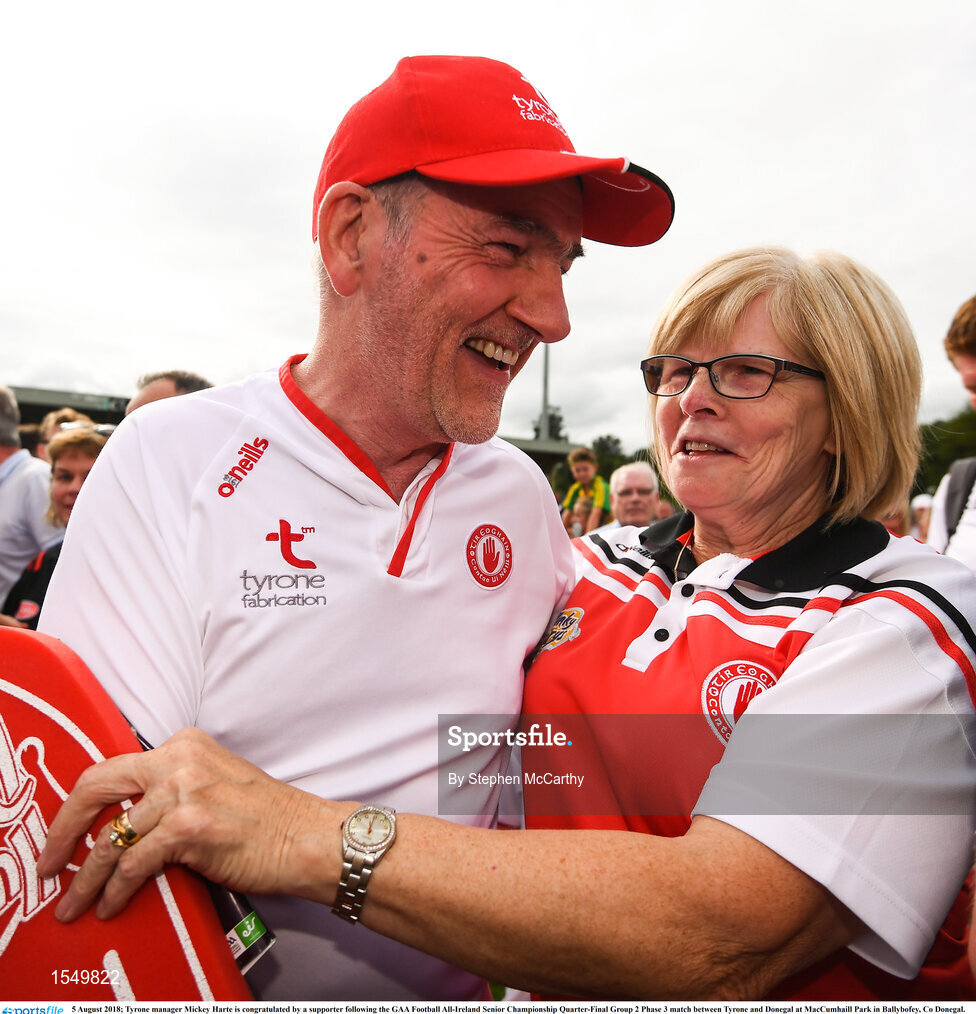 5 August 2018; Tyrone manager Mickey Harte is congratulated by a supporter following the GAA Football All-Ireland Senior Championship Quarter-Final Group 2 Phase 3 match between Tyrone and Donegal at MacCumhaill Park in Ballybofey, Co Donegal. Photo by Stephen McCarthy/Sportsfile