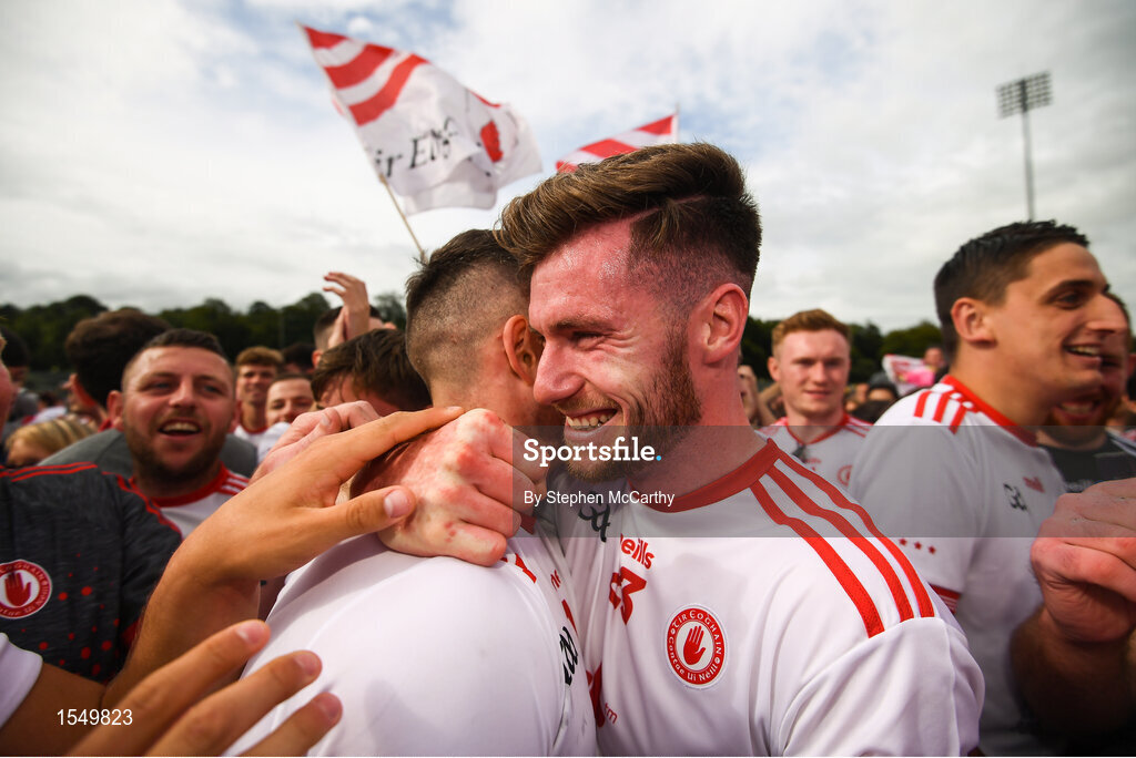 5 August 2018; Declan McClure, right, and Richard Donnelly of Tyrone celebrate following the GAA Football All-Ireland Senior Championship Quarter-Final Group 2 Phase 3 match between Tyrone and Donegal at MacCumhaill Park in Ballybofey, Co Donegal. Photo by Stephen McCarthy/Sportsfile