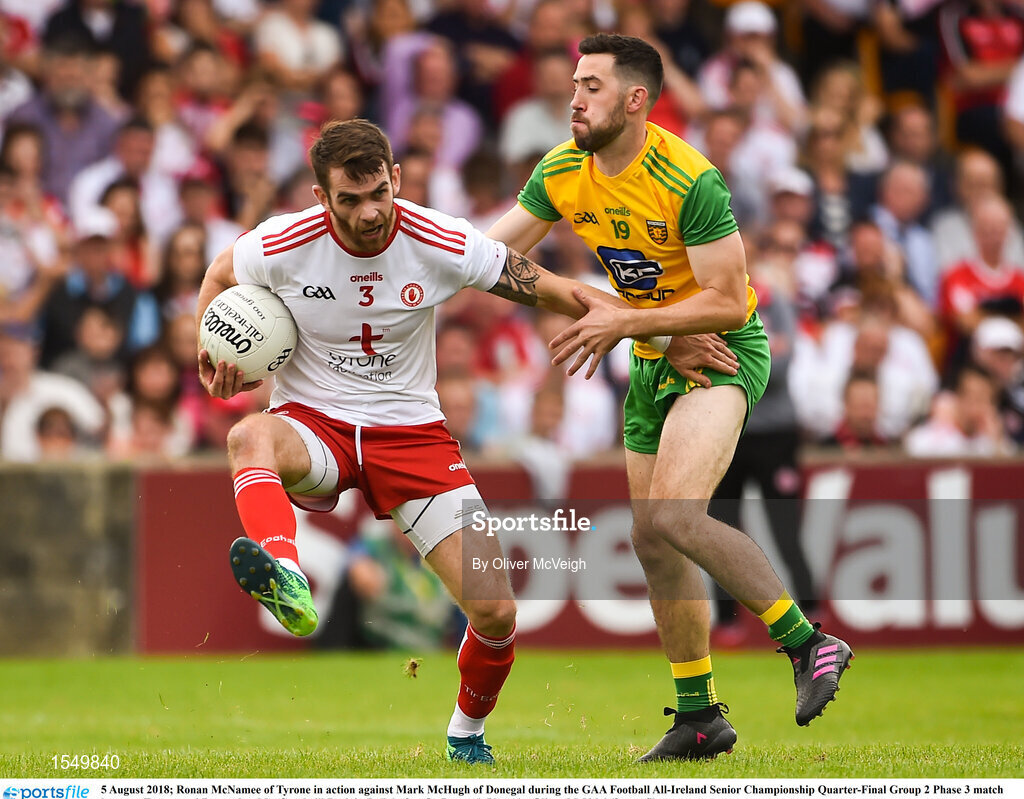 5 August 2018; Ronan McNamee of Tyrone in action against Mark McHugh of Donegal during the GAA Football All-Ireland Senior Championship Quarter-Final Group 2 Phase 3 match between Tyrone and Donegal at MacCumhaill Park in Ballybofey, Co Donegal. Photo by Oliver McVeigh/Sportsfile