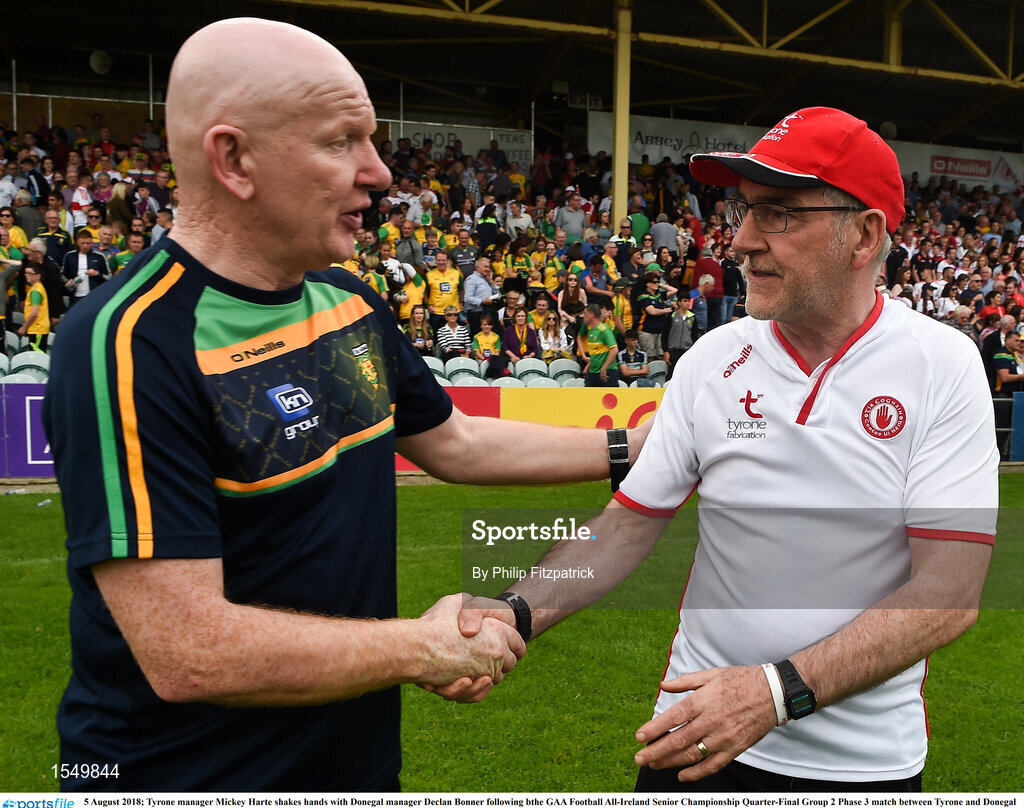 5 August 2018; Tyrone manager Mickey Harte shakes hands with Donegal manager Declan Bonner following bthe GAA Football All-Ireland Senior Championship Quarter-Final Group 2 Phase 3 match between Tyrone and Donegal at MacCumhaill Park in Ballybofey, Co Donegal. Photo by Philip Fitzpatrick/Sportsfile
