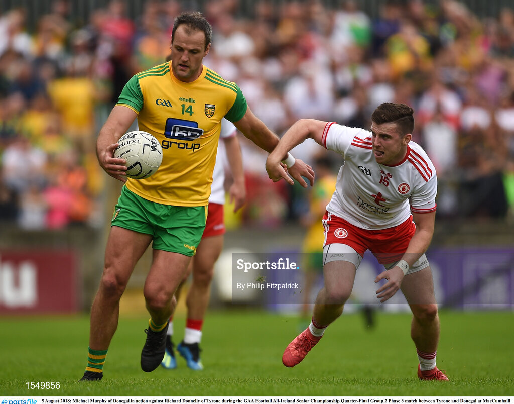 5 August 2018; Michael Murphy of Donegal in action against Richard Donnelly of Tyrone during the GAA Football All-Ireland Senior Championship Quarter-Final Group 2 Phase 3 match between Tyrone and Donegal at MacCumhaill Park in Ballybofey, Co Donegal. Photo by Philip Fitzpatrick/Sportsfile