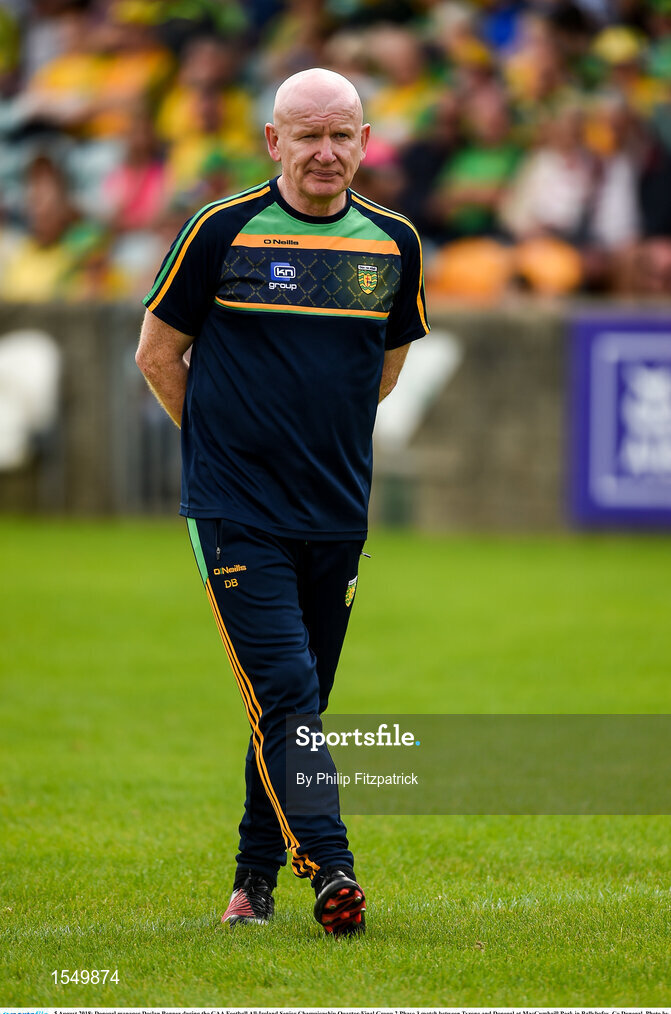 5 August 2018; Donegal manager Declan Bonner during the GAA Football All-Ireland Senior Championship Quarter-Final Group 2 Phase 3 match between Tyrone and Donegal at MacCumhaill Park in Ballybofey, Co Donegal. Photo by Philip Fitzpatrick/Sportsfile