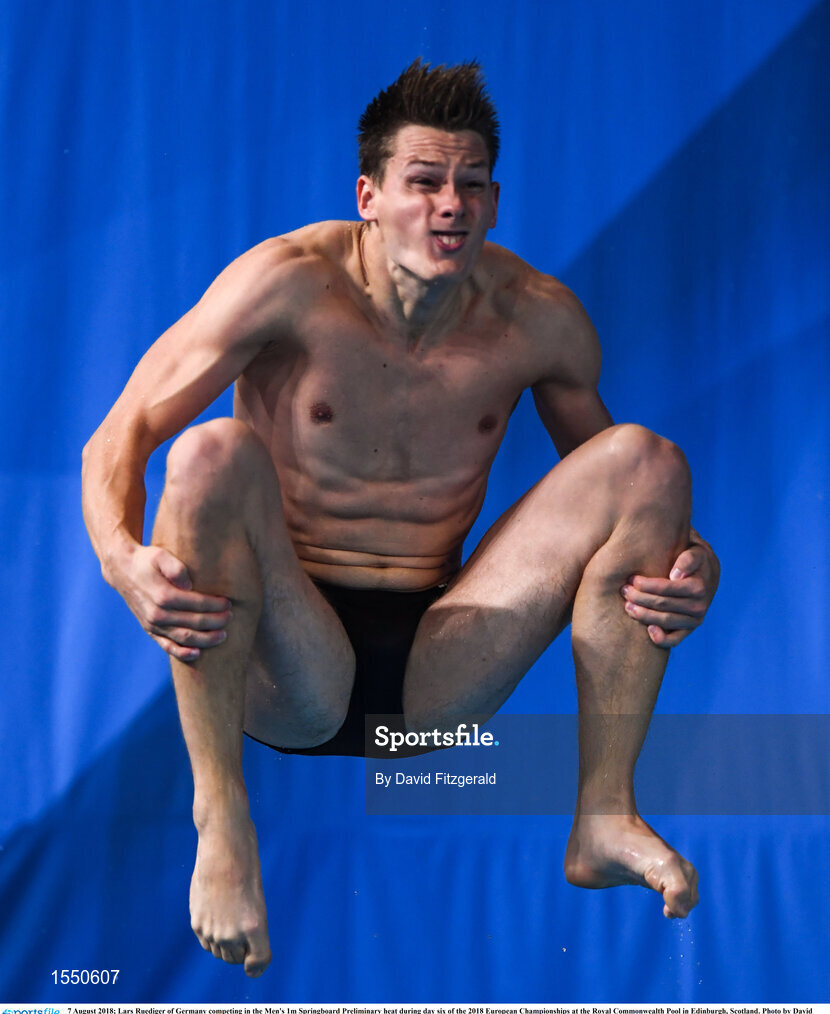 7 August 2018; Lars Ruediger of Germany competing in the Men's 1m Springboard Preliminary heat during day six of the 2018 European Championships at the Royal Commonwealth Pool in Edinburgh, Scotland. Photo by David Fitzgerald/Sportsfile