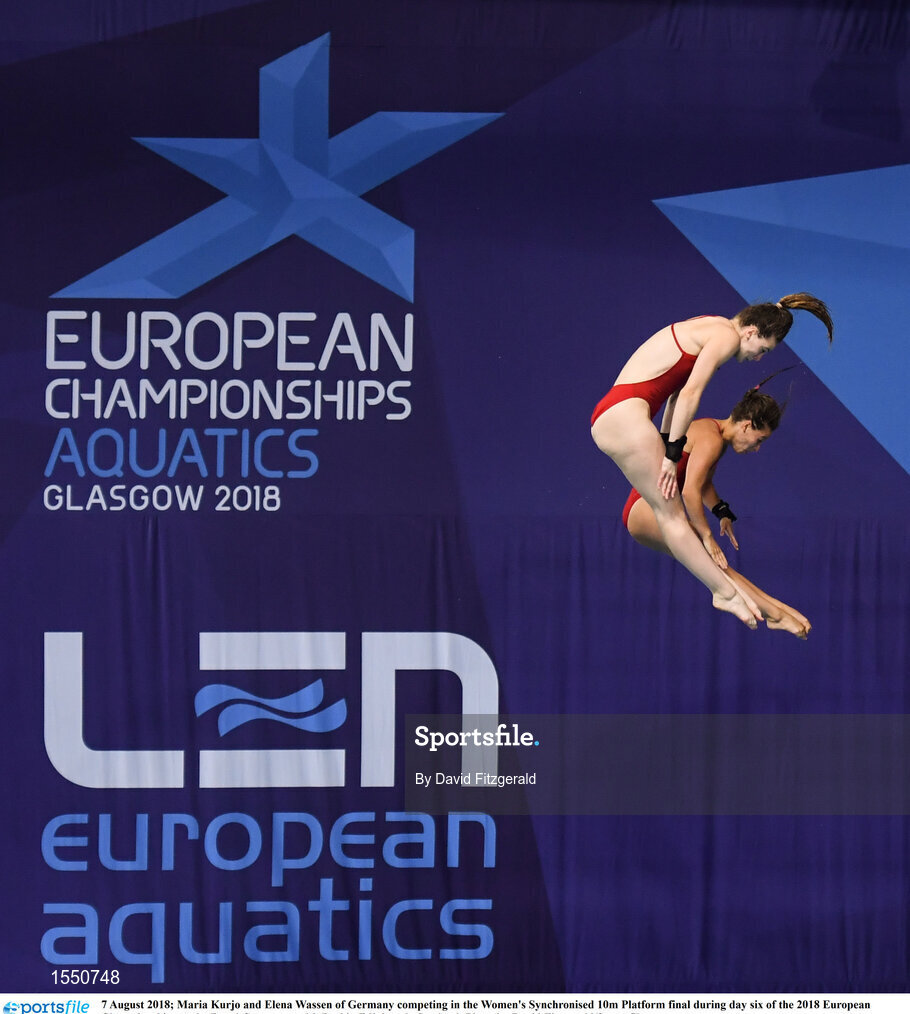 7 August 2018; Maria Kurjo and Elena Wassen of Germany competing in the Women's Synchronised 10m Platform final during day six of the 2018 European Championships at the Royal Commonwealth Pool in Edinburgh, Scotland. Photo by David Fitzgerald/Sportsfile