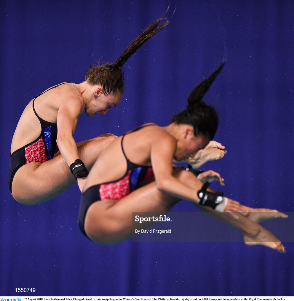 7 August 2018; Lois Toulson and Eden Cheng of Great Britain competing in the Women's Synchronised 10m Platform final during day six of the 2018 European Championships at the Royal Commonwealth Pool in Edinburgh, Scotland. Photo by David Fitzgerald/Sportsfile