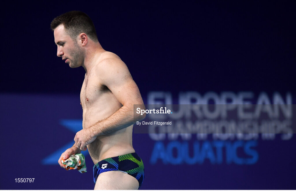 7 August 2018; Oliver Dingley of Ireland prior to his final dive in the Men's 1m Springboard Preliminary final during day six of the 2018 European Championships at the Royal Commonwealth Pool in Edinburgh, Scotland. Photo by David Fitzgerald/Sportsfile