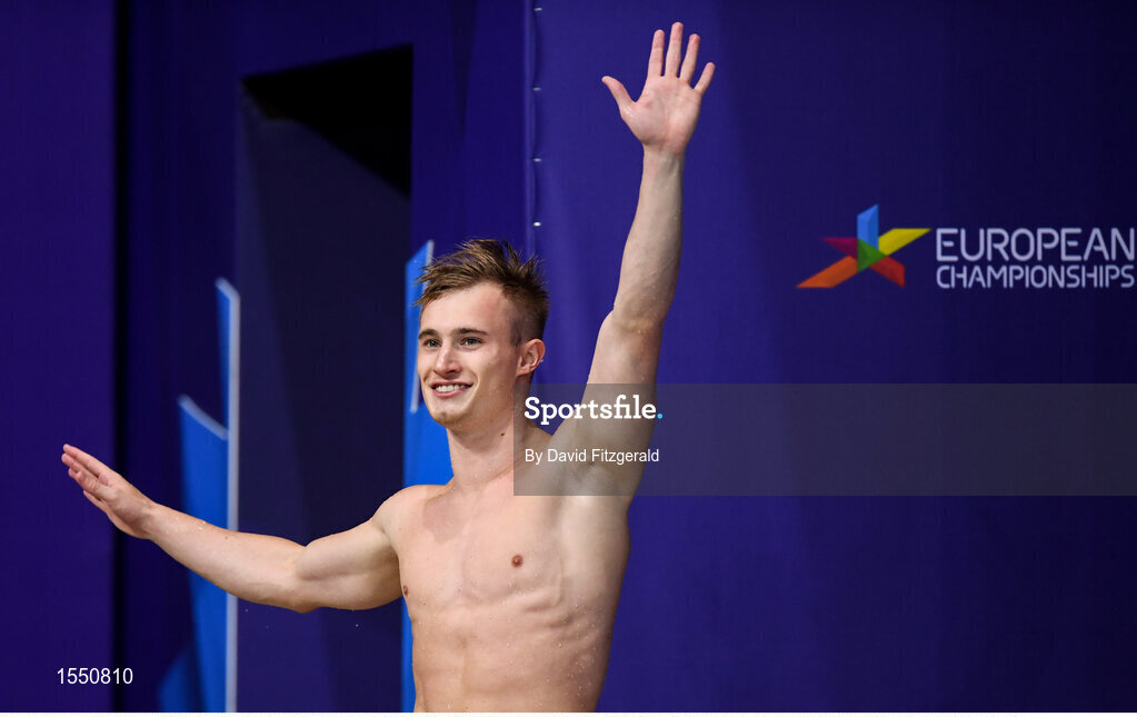 7 August 2018; Jack Laugher of Great Britain reacts as he looks at the scoreboard following his final dive in the Men's 1m Springboard Preliminary final during day six of the 2018 European Championships at the Royal Commonwealth Pool in Edinburgh, Scotland. Photo by David Fitzgerald/Sportsfile