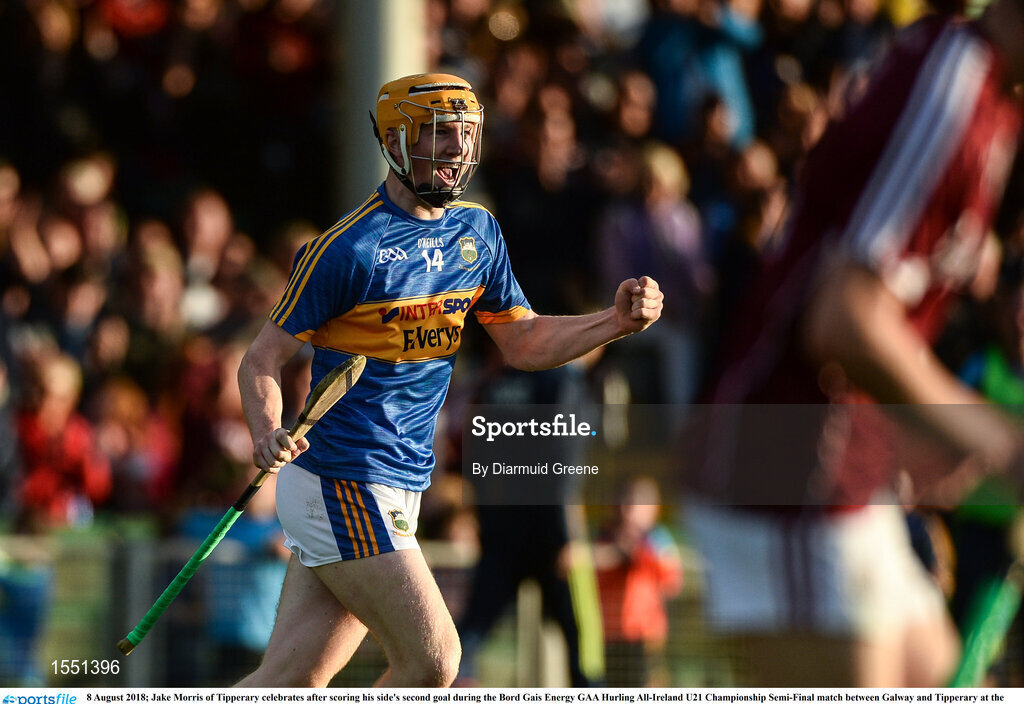 8 August 2018; Jake Morris of Tipperary celebrates after scoring his side's second goal during the Bord Gais Energy GAA Hurling All-Ireland U21 Championship Semi-Final match between Galway and Tipperary at the Gaelic Grounds in Limerick. Photo by Diarmuid Greene/Sportsfile