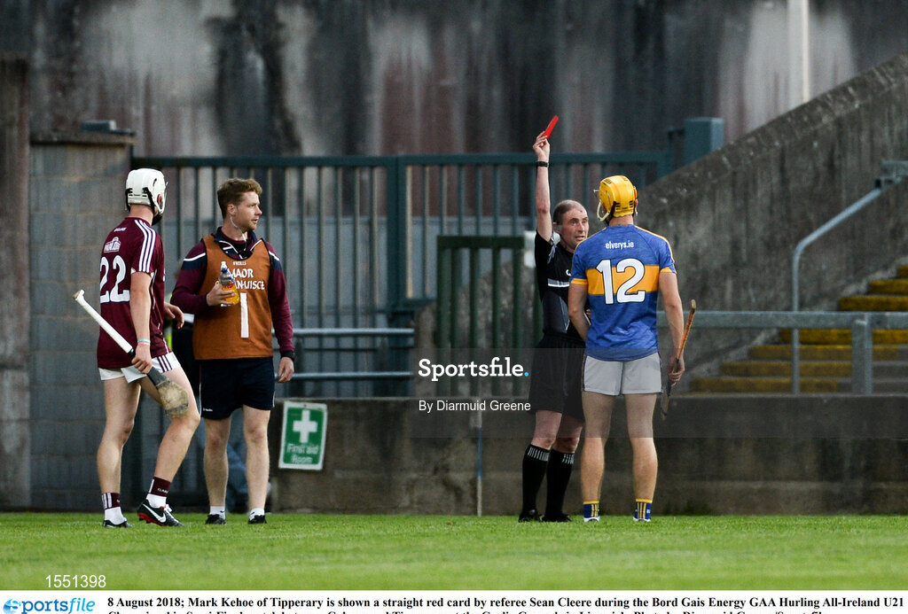 8 August 2018; Mark Kehoe of Tipperary is shown a straight red card by referee Sean Cleere during the Bord Gais Energy GAA Hurling All-Ireland U21 Championship Semi-Final match between Galway and Tipperary at the Gaelic Grounds in Limerick. Photo by Diarmuid Greene/Sportsfile