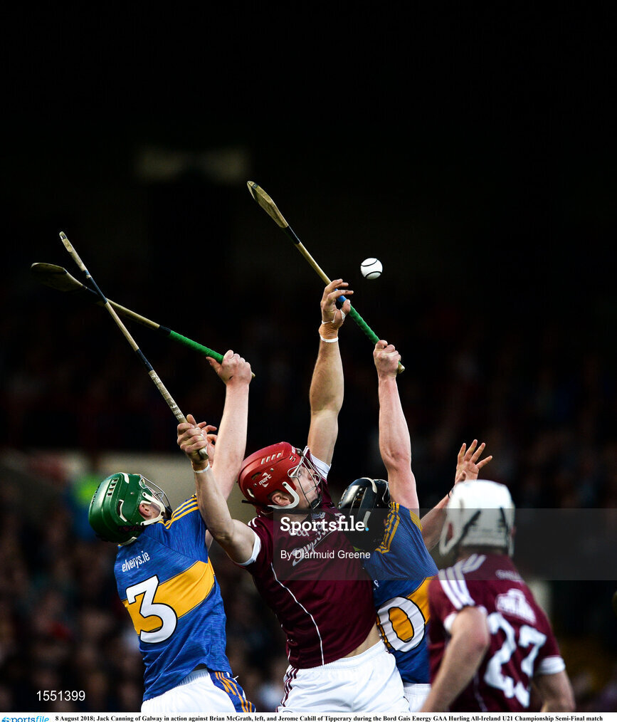 8 August 2018; Jack Canning of Galway in action against Brian McGrath, left, and Jerome Cahill of Tipperary during the Bord Gais Energy GAA Hurling All-Ireland U21 Championship Semi-Final match between Galway and Tipperary at the Gaelic Grounds in Limerick. Photo by Diarmuid Greene/Sportsfile