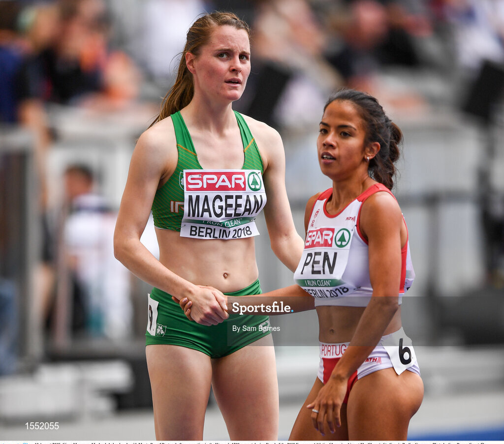 10 August 2018; Ciara Mageean of Ireland shakes hands with Marta Pen of Portugal after competing in the Women's 1500m event during Day 4 of the 2018 European Athletics Championships at The Olympic Stadium in Berlin, Germany. Photo by Sam Barnes/Sportsfile