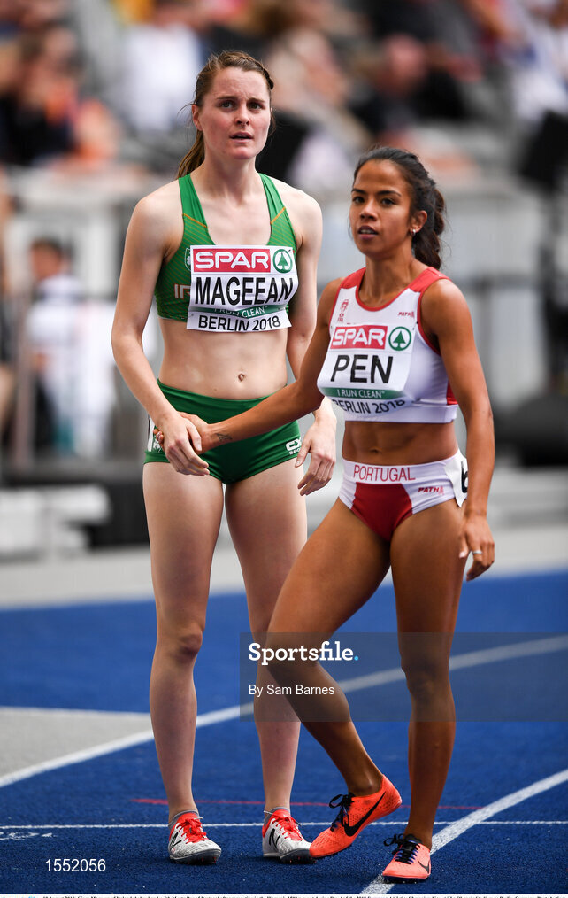 10 August 2018; Ciara Mageean of Ireland shakes hands with Marta Pen of Portugal after competing in the Women's 1500m event during Day 4 of the 2018 European Athletics Championships at The Olympic Stadium in Berlin, Germany. Photo by Sam Barnes/Sportsfile
