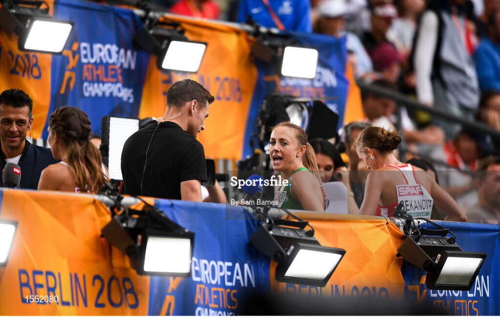 10 August 2018; Kerry O'Flaherty of Ireland, is interviewed by David Gillick for RTE after competing in the Women's 3000m Steeplechase event during Day 4 of the 2018 European Athletics Championships at The Olympic Stadium in Berlin, Germany. Photo by Sam Barnes/Sportsfile