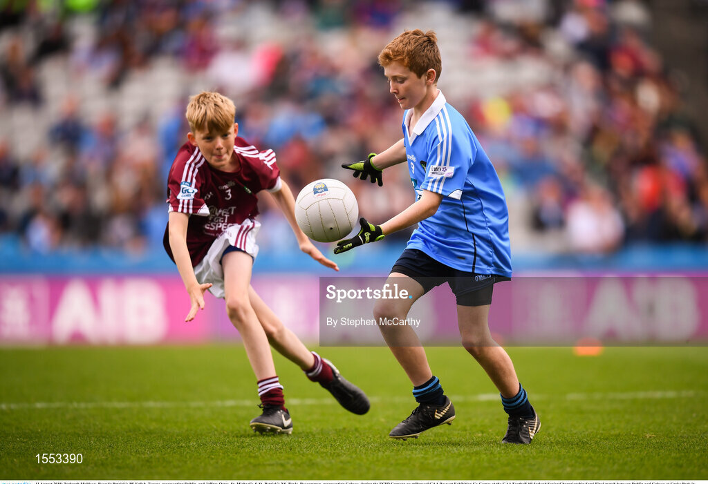 11 August 2018; Turlough Muldoon, Roan St Patrick’s PS Eglish, Tyrone, representing Dublin, and Jeffrey Oates, St. Michael’s & St. Patrick’s NS, Boyle, Roscommon, representing Galway, during the INTO Cumann na mBunscol GAA Respect Exhibition Go Games at the GAA Football All-Ireland Senior Championship Semi Final match between Dublin and Galway at Croke Park in Dublin. Photo by Stephen McCarthy/Sportsfile