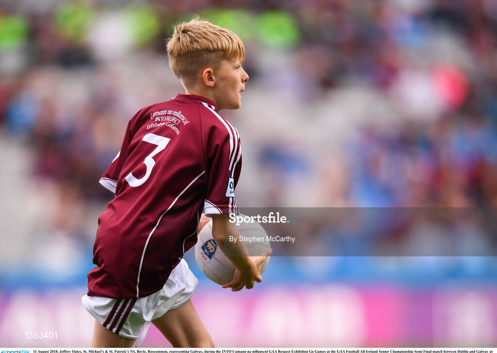 11 August 2018; Jeffrey Oates, St. Michael’s & St. Patrick’s NS, Boyle, Roscommon, representing Galway, during the INTO Cumann na mBunscol GAA Respect Exhibition Go Games at the GAA Football All-Ireland Senior Championship Semi Final match between Dublin and Galway at Croke Park in Dublin. Photo by Stephen McCarthy/Sportsfile