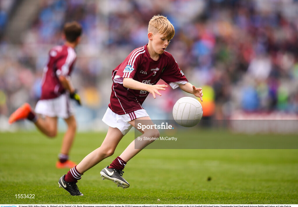11 August 2018; Jeffrey Oates, St. Michael’s & St. Patrick’s NS, Boyle, Roscommon, representing Galway, during the INTO Cumann na mBunscol GAA Respect Exhibition Go Games at the GAA Football All-Ireland Senior Championship Semi Final match between Dublin and Galway at Croke Park in Dublin. Photo by Stephen McCarthy/Sportsfile