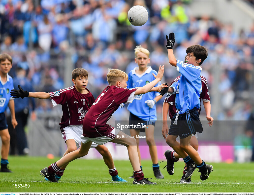 11 August 2018; Joey Dalton, Borris NS, Borris, Carlow, representing Dublin, in action against Jeffrey Oates, St. Michael’s & St. Patrick’s NS, Boyle, Roscommon, representing Galway, during the INTO Cumann na mBunscol GAA Respect Exhibition Go Games at the GAA Football All-Ireland Senior Championship Semi Final match between Dublin and Galway at Croke Park in Dublin. Photo by Brendan Moran/Sportsfile