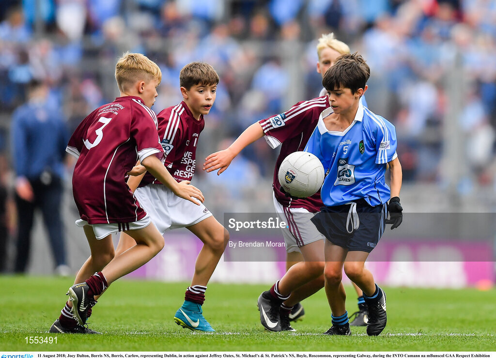 11 August 2018; Joey Dalton, Borris NS, Borris, Carlow, representing Dublin, in action against Jeffrey Oates, St. Michael’s & St. Patrick’s NS, Boyle, Roscommon, representing Galway, during the INTO Cumann na mBunscol GAA Respect Exhibition Go Games at the GAA Football All-Ireland Senior Championship Semi Final match between Dublin and Galway at Croke Park in Dublin. Photo by Brendan Moran/Sportsfile
