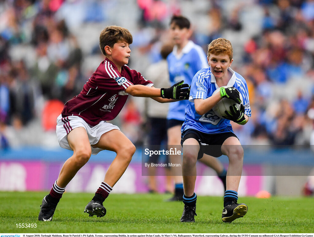 11 August 2018; Turlough Muldoon, Roan St Patrick’s PS Eglish, Tyrone, representing Dublin, in action against Dylan Coady, St Mary’s NS, Ballygunner, Waterford, representing Galway, during the INTO Cumann na mBunscol GAA Respect Exhibition Go Games at the GAA Football All-Ireland Senior Championship Semi Final match between Dublin and Galway at Croke Park in Dublin. Photo by Brendan Moran/Sportsfile