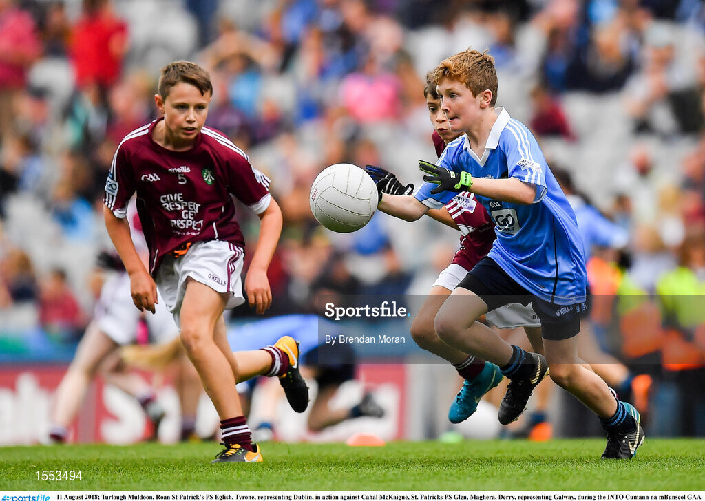 11 August 2018; Turlough Muldoon, Roan St Patrick’s PS Eglish, Tyrone, representing Dublin, in action against Cahal McKaigue, St. Patricks PS Glen, Maghera, Derry, representing Galway, during the INTO Cumann na mBunscol GAA Respect Exhibition Go Games at the GAA Football All-Ireland Senior Championship Semi Final match between Dublin and Galway at Croke Park in Dublin. Photo by Brendan Moran/Sportsfile