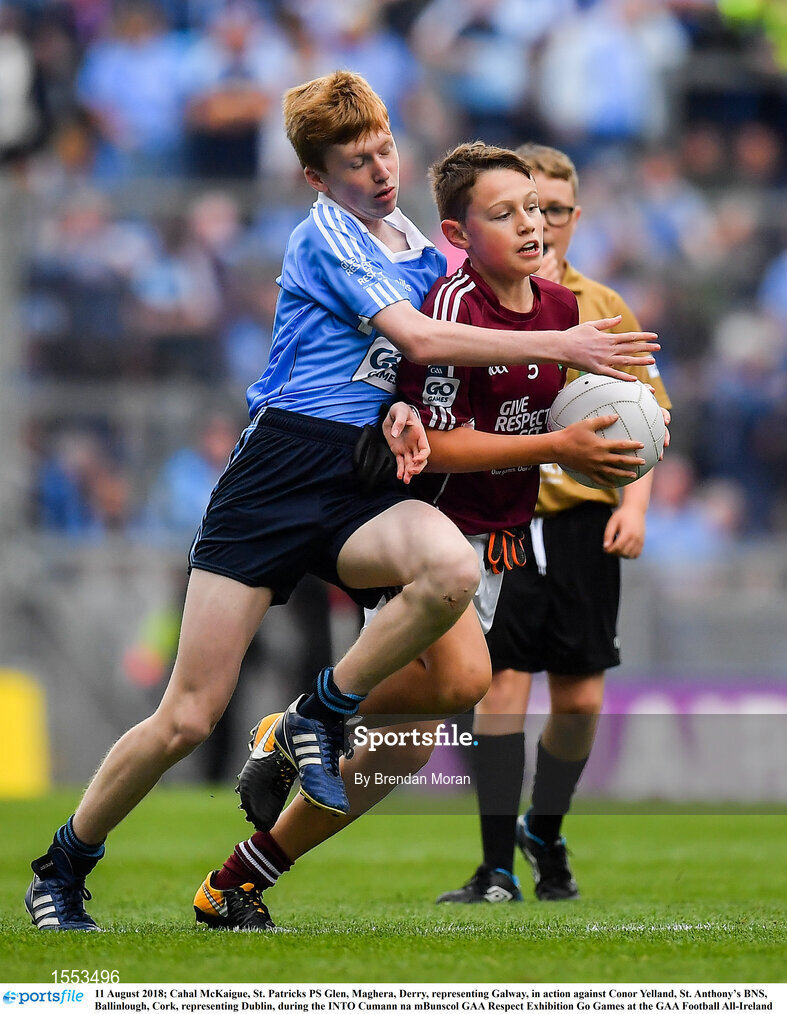 11 August 2018; Cahal McKaigue, St. Patricks PS Glen, Maghera, Derry, representing Galway, in action against Conor Yelland, St. Anthony’s BNS, Ballinlough, Cork, representing Dublin, during the INTO Cumann na mBunscol GAA Respect Exhibition Go Games at the GAA Football All-Ireland Senior Championship Semi Final match between Dublin and Galway at Croke Park in Dublin. Photo by Brendan Moran/Sportsfile