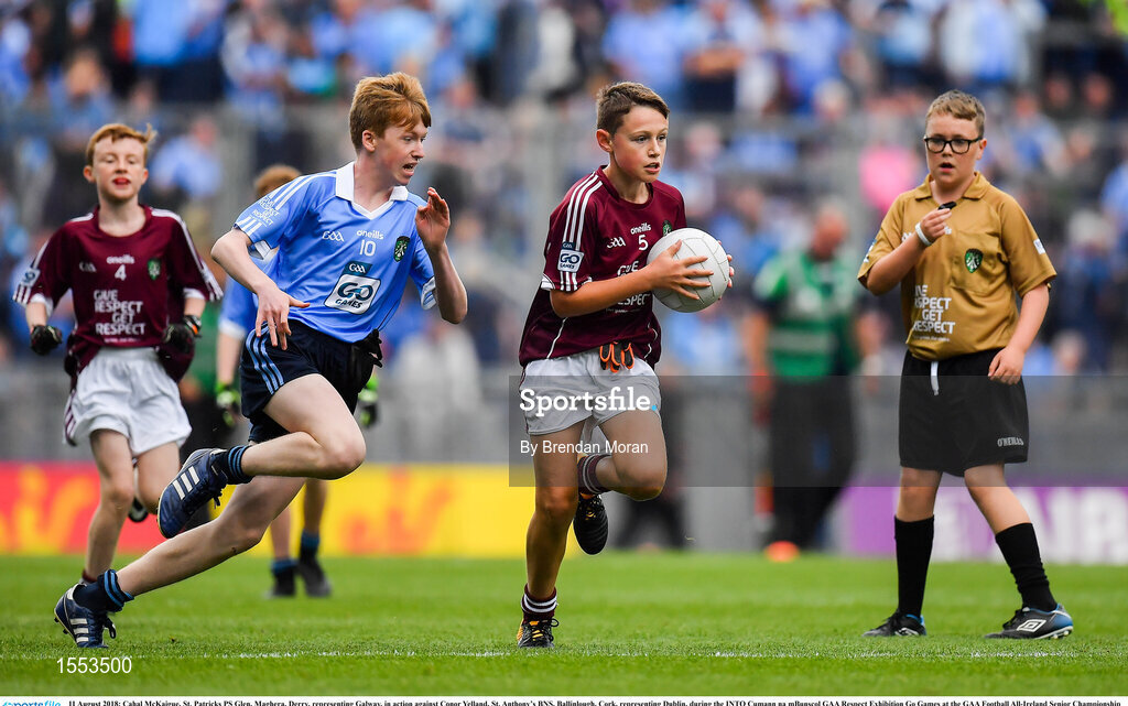 11 August 2018; Cahal McKaigue, St. Patricks PS Glen, Maghera, Derry, representing Galway, in action against Conor Yelland, St. Anthony’s BNS, Ballinlough, Cork, representing Dublin, during the INTO Cumann na mBunscol GAA Respect Exhibition Go Games at the GAA Football All-Ireland Senior Championship Semi Final match between Dublin and Galway at Croke Park in Dublin. Photo by Brendan Moran/Sportsfile