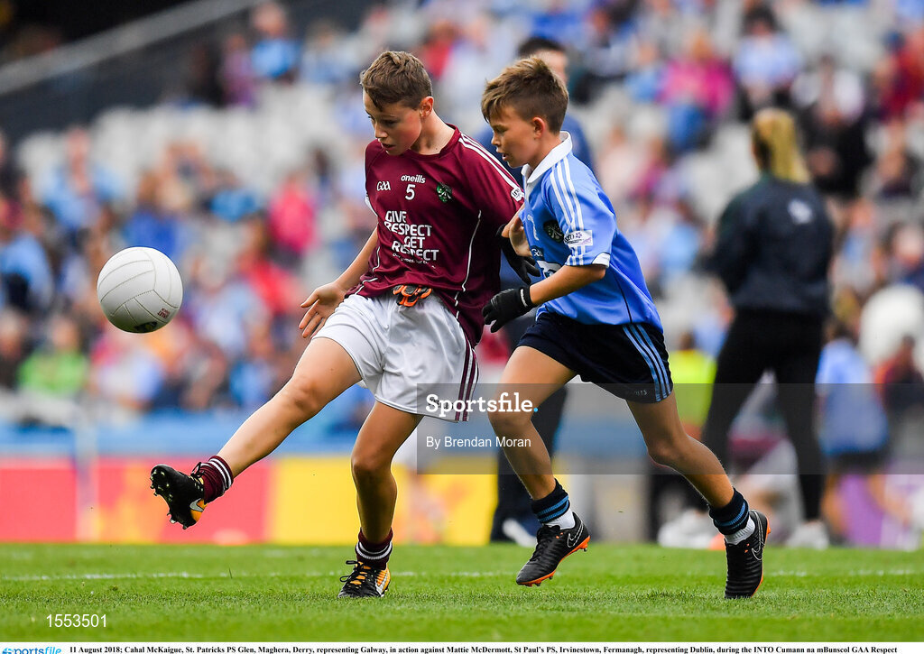 11 August 2018; Cahal McKaigue, St. Patricks PS Glen, Maghera, Derry, representing Galway, in action against Mattie McDermott, St Paul’s PS, Irvinestown, Fermanagh, representing Dublin, during the INTO Cumann na mBunscol GAA Respect Exhibition Go Games at the GAA Football All-Ireland Senior Championship Semi Final match between Dublin and Galway at Croke Park in Dublin. Photo by Brendan Moran/Sportsfile