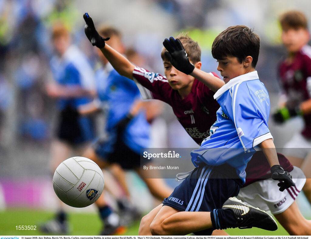 11 August 2018; Joey Dalton, Borris NS, Borris, Carlow, representing Dublin, in action against David Duffy, St. Mary’s NS Glaslough, Monaghan, representing Galway, during the INTO Cumann na mBunscol GAA Respect Exhibition Go Games at the GAA Football All-Ireland Senior Championship Semi Final match between Dublin and Galway at Croke Park in Dublin. Photo by Brendan Moran/Sportsfile