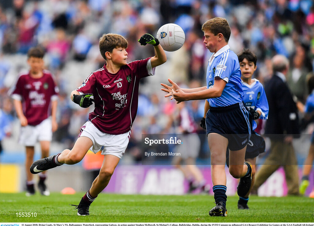 11 August 2018; Dylan Coady, St Mary’s NS, Ballygunner, Waterford, representing Galway, in action against Stephen McDowell, St.Michael’s College, Ballsbridge, Dublin, during the INTO Cumann na mBunscol GAA Respect Exhibition Go Games at the GAA Football All-Ireland Senior Championship Semi Final match between Dublin and Galway at Croke Park in Dublin. Photo by Brendan Moran/Sportsfile