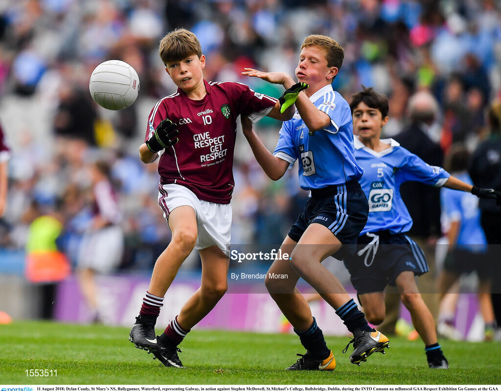 11 August 2018; Dylan Coady, St Mary’s NS, Ballygunner, Waterford, representing Galway, in action against Stephen McDowell, St.Michael’s College, Ballsbridge, Dublin, during the INTO Cumann na mBunscol GAA Respect Exhibition Go Games at the GAA Football All-Ireland Senior Championship Semi Final match between Dublin and Galway at Croke Park in Dublin. Photo by Brendan Moran/Sportsfile